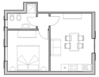 Monolocale Loft: di circa 20mq + 10mq di soppalco. L’appartamento è composto da cucina con divano letto ad una piazza per ragazzi massimo 14 anni, bagno con doccia, soppalco con camera matrimoniale, veranda privata con tavolo e poltroncine, aria condizionata.